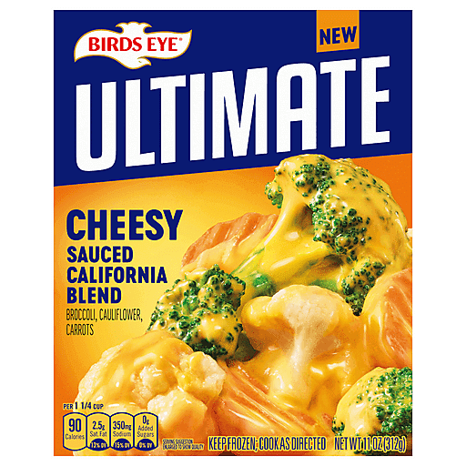 Treat yourself to the ultimate veggie experience with Birds Eye Ultimate Cheesy Sauced California Blend! Enjoy every bite of broccoli, cauliflower and carrots smothered in a deliciously indulgent cheese sauce. We've turned up the flavor with 50% more cheese* for maximum cheesy goodness! Birds Eye Ultimate Cheesy California Blend comes in a convenient microwave tray so you can enjoy perfectly cheesy vegetables in just a few minutes. Whether you're looking for a convenient side for two, or a quick veggie side dish for one, take your flavor to the next level with Birds Eye Ultimate.
