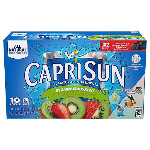 Grab a little juicy freedom with Capri Sun Strawberry Kiwi Flavored with other natural flavor Juice Drink Blend. Kids will love the taste of our Capri Sun, made with a new and improved formula. Made with the all-natural sweetener, monk fruit, our Strawberry Kiwi juice drink blend has ripe strawberries and tart kiwis for a flavor that’s joyfully refreshing. We never add artificial flavors, colors, preservatives or high-fructose corn syrup to our pouches. Each 6 fluid ounce pouch in our 10 count box comes with a straw, so they're ready for kids to squeeze and sip. Unleash kids' independence with a ready-to-drink Capri Sun. Find Pokemon Legends on our limited-edition packs — get yours while they last!