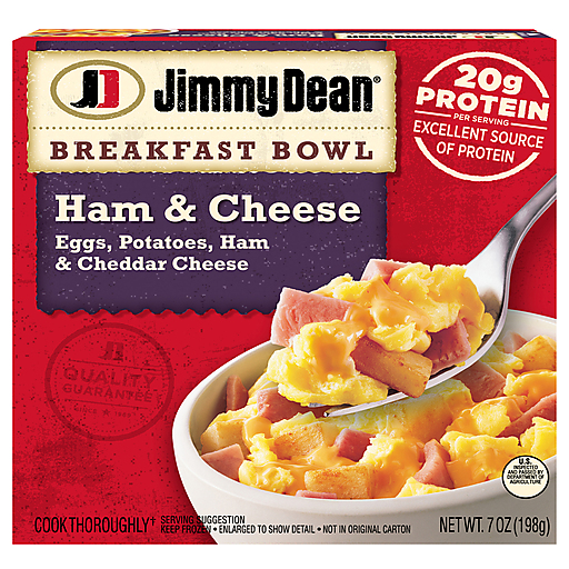 Enjoy all of your breakfast favorites in one bowl with a Jimmy Dean Ham, Egg, Potatoes and Cheese Breakfast Bowl. Filled with savory ham, fluffy scrambled eggs, homestyle potatoes and real cheddar cheese, this Jimmy Dean frozen meal is sure to be the best part of your morning. With 18 grams of protein per serving, these frozen family meals are a delicious option for your breakfast routine.