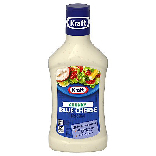 Kraft Chunky Blue Cheese Dressing uses quality ingredients for a delicious, classic taste that shakes up your salads. Tanginess from vinegar and sweetness from sugar team up with blue cheese to create a zesty, full-bodied taste with a texture you love. Premixed and ready to use, our dressing offers a convenient way to enhance your meals, and with no high-fructose corn syrup or added MSG, you get the taste you love without the extras. Use our blue cheese dressing as a dipping sauce for hot wings, a dressing for salad or as a burst of flavor in your favorite coleslaw recipe. Our 16 fluid ounce bottle makes it easy to pour dressing without making a mess. Keep the bottle refrigerated after opening.