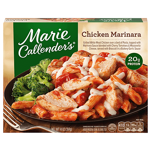 Marie Callender's Chicken Marinara is easy to make, comfortingly delicious and hard to resist. This frozen dinner includes premium, grilled white meat chicken breast over a bed of pasta noodles, topped with marinara sauce blended with cherry tomatoes and mozzarella cheese, and served with broccoli drizzled in a buttery garlic sauce. Enjoy a warm, satisfying chicken pasta dinner without the prep and cleanup with this microwavable meal. Perfect for cozy nights when you don't want to cook or at lunchtime when things are extra busy, this is the frozen pasta meal that doesn't disappoint! Plus, there are 20 g of protein per serving and no artificial flavors, artificial colors or preservatives ... just quality ingredients that never sacrifice taste. Choose Marie Callender's frozen meals to simplify mealtime anytime.