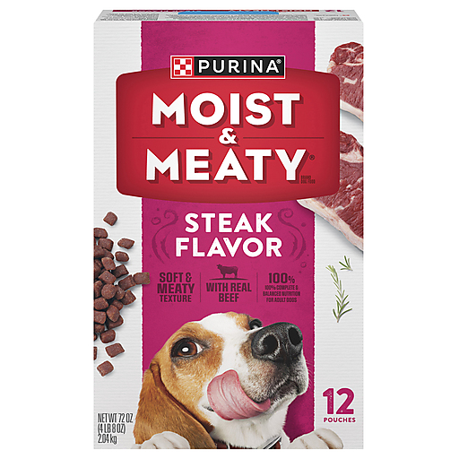 Serve up the smiles for your dog with Purina Moist and Meaty Steak Flavor adult dog food. The convenient individual Purina Moist and Meaty dog food pouches make it easy to fill their bowl with a 100 percent complete and balanced meal for adult dogs, offering the real meat dog food taste and soft texture dogs crave. Stay-fresh pouches keep every bite tender and full of mouthwatering beef dog food flavor. We make this semi moist dog food with real beef, with each serving supplying the high-quality protein he needs for strong muscles. Use these soft dry dog food pouches as single-serve meals, snacks, or dog meal toppers sprinkled over his wet or dry food to make his meals twice as exciting. Don’t keep your dog waiting; serve Purina Moist and Meaty Steak Flavor pouches. There’s no cleanup for you, and the delectable meaty bites made with real beef in our soft and moist dog food pouches might just convince him he’s ordering off the people menu.