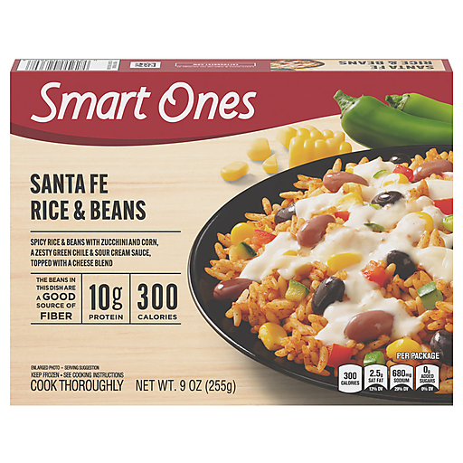 The easy way to make deliciously smart choices. Smart Ones Santa Fe Rice & Beans offers a quick meal solution for lunch or dinner. Our Mexican cuisine features spicy rice and beans with zucchini and corn, a zesty green chile and sour cream sauce, topped with a cheese blend. Each meal contains 300 calories, 10 grams of protein and 7 WW Points® per serving. Our Tex-Mex dish contains no preservatives and the beans in this dish are a good source of fiber. Ideal for an easy dinner, our convenient meal includes a microwave tray for effortless meal preparation. Cook as directed. Keep our frozen food in the freezer until ready to prepare and cook thoroughly.